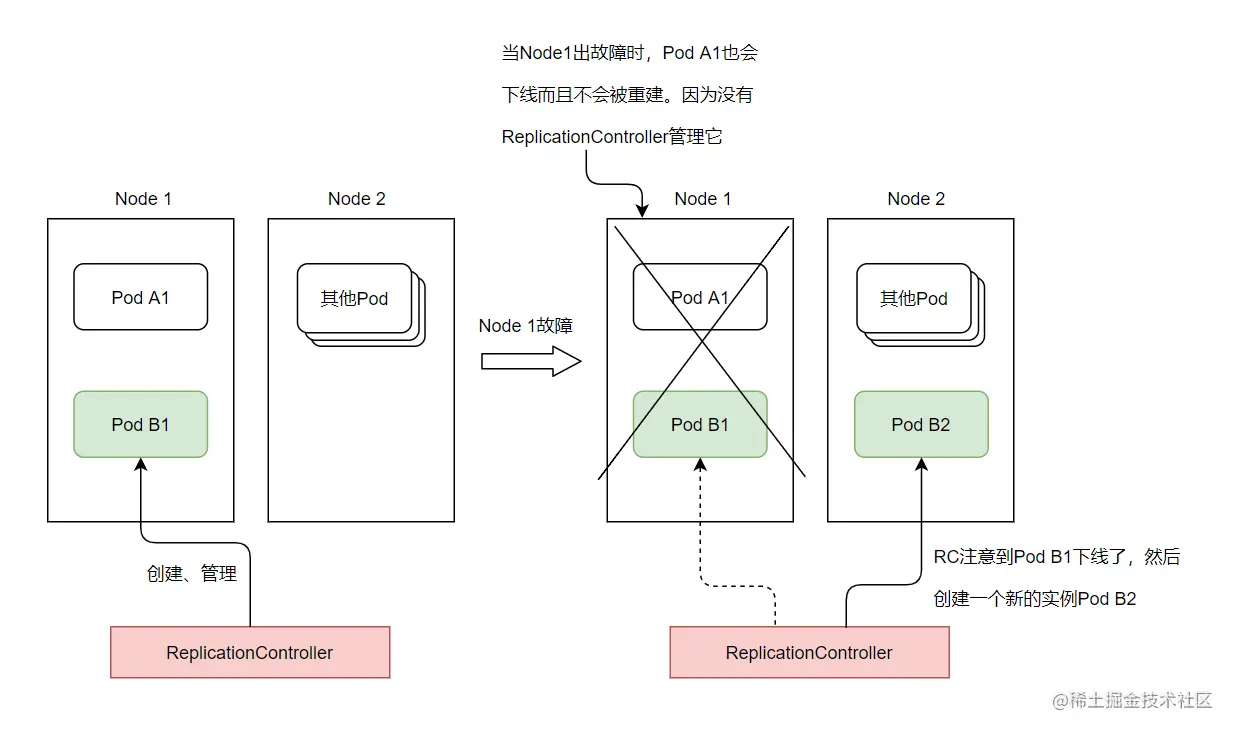 下图演示了当一个包含两个Pod的节点下线了会发生什么。Pod A是用户直接创建的,因此是一个非托管的Pod;Pod B是由ReplicationController管理的。当节点下线后,ReplicationController会创建一个新的Pod替换消失的Pod B,而Pod A就完全消失了,因为没有什么能恢复它。