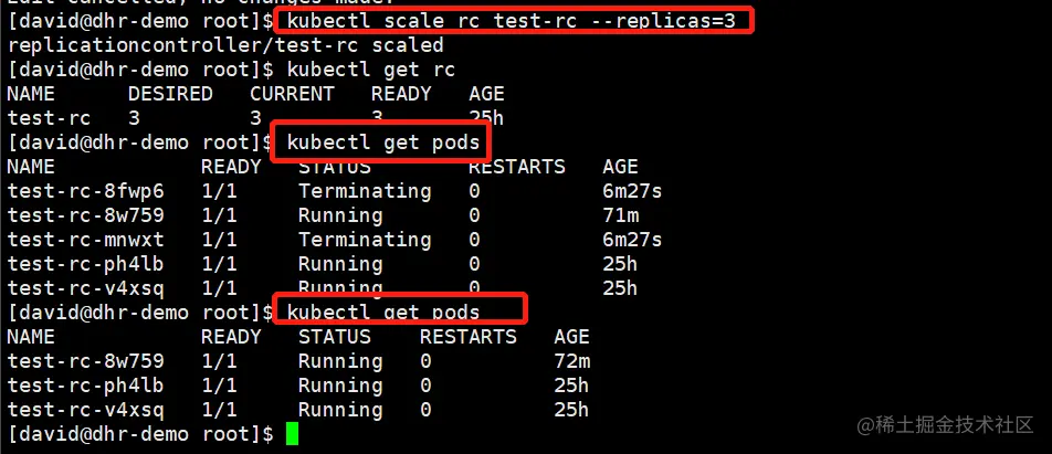 当前,我们的ReplicationController保证有三个pod实例在运行。现在将其扩容到5个pod,可以通过如下方式来实现:kubectl scale rc test-rc --replicas=5