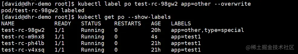 kubectl label po test-rc-98gw2 app=other --overwrite