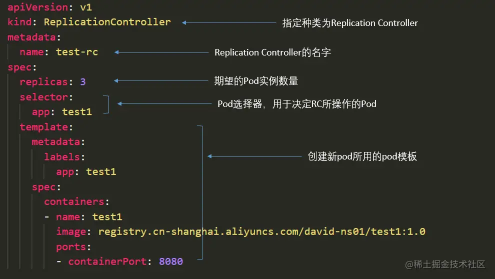 当我们将这个文件发送给API Server时,Kubernetes会创建一个新的名为test-rc的ReplicationController,它会确保始终有三个pod实例与标签选择器app=test1匹配。当没有pod数量不够时,就会基于指定的pod模板创建新的pod。从上面的YAML文件可以看到,pod模板的内容与我们之前创建的pod定义几乎一样。