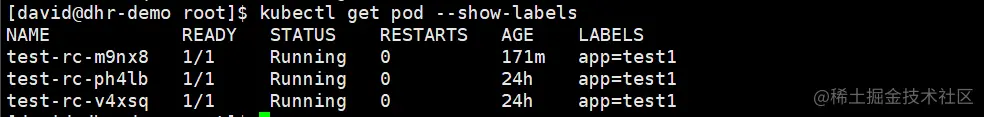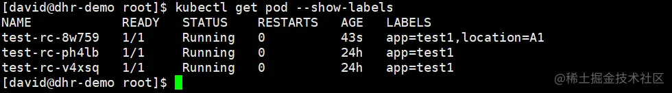 可以看到pod的标签还未变化。但是如果我们删除一个pod,ReplicationController就会自动创建一个新的pod,并且多了一个locaton=A1标签: