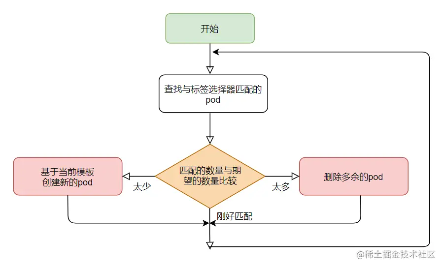Reconciliation Loop就是不断使系统的当前状态向用户期望的状态移动,从而形成了一个循环的结构。ReplicationController的工作就是要确保Pod的实际数量始终与其标签选择器筛选出的数量匹配。如果不匹配,ReplicationController就会采取适当的操作来协调(reconcile)Pod的数量。如下图: