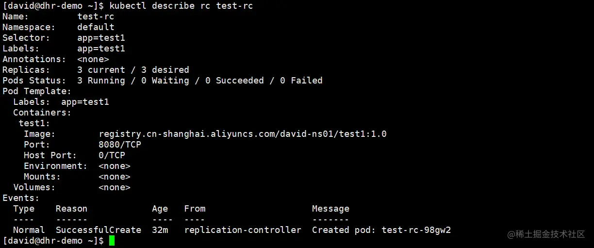 可以看到当前的副本(replica)数与期望的副本数是匹配的。底部的Events区域显示的是ReplicationController所执行的操作。