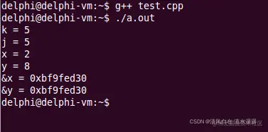 还有一个问题就是 x 和 y 值的问题。x 是一个真正意义上的常量,所以编译期间值确定了就是2,但是编译器要兼容 C语言,所以会给 x 在栈空间分配了4个字节的空间出来,使用 const_cast 作用于它就相当于给这 4个字节空间取了一个别名 y,令 y = 8,就相当于给这 4个字节栈空间中的 int 变量赋了一个值 8。所以打印出来的 x 和 y的地址值是一样的。