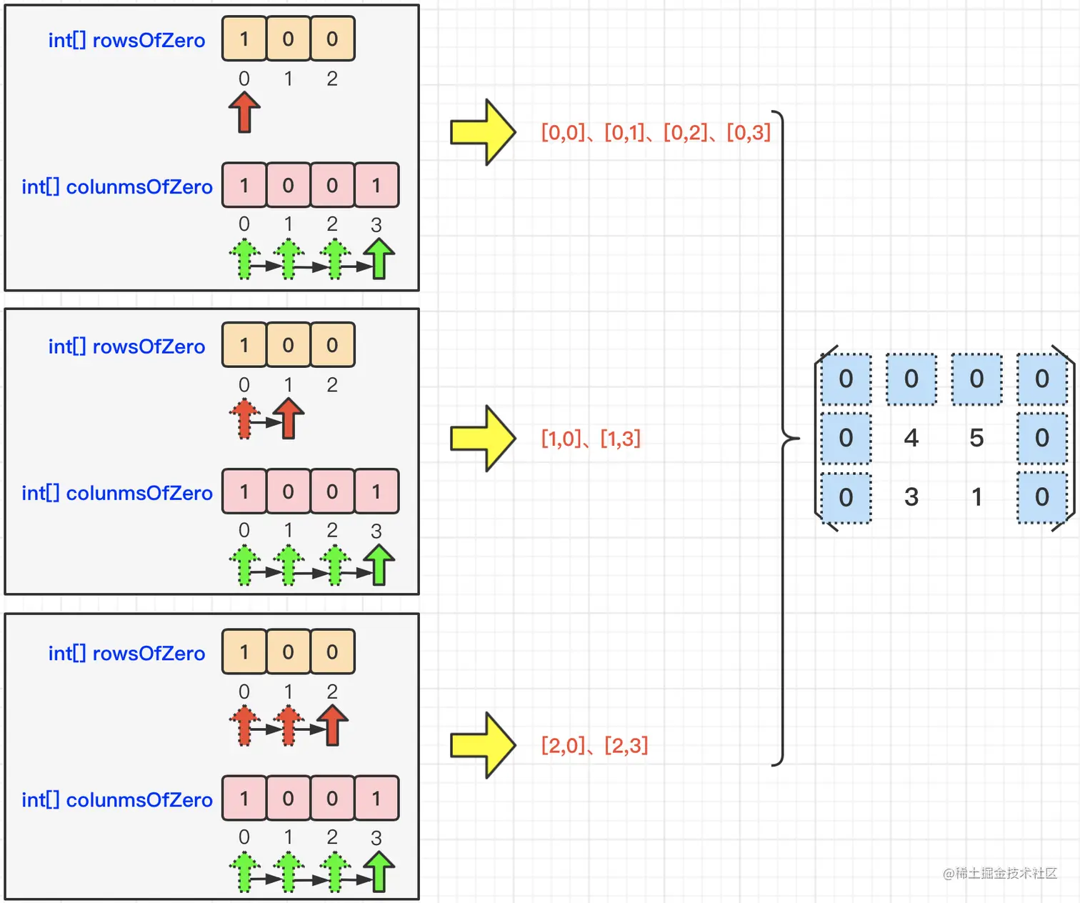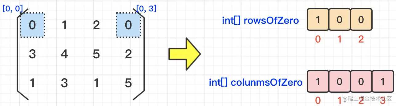 然后,我们就遍历入参matrix矩阵,找到元素值等于0的元素,然后将其行号&列号对应到上面的两个数组,并将其修改为1。我们以下图为例,遍历下图中的矩阵,我们找到了[0, 0]和[0, 3]这两个元素的值等于0,那么这两个元素对应的行号都是:0,对应的列号分别是:0和3。那么,映射到上面提到的两个数组,就变成了:rowsOfZero=[1, 0, 0] 和 columnsOfZero=[1, 0, 0, 1]。具体如下图所示: