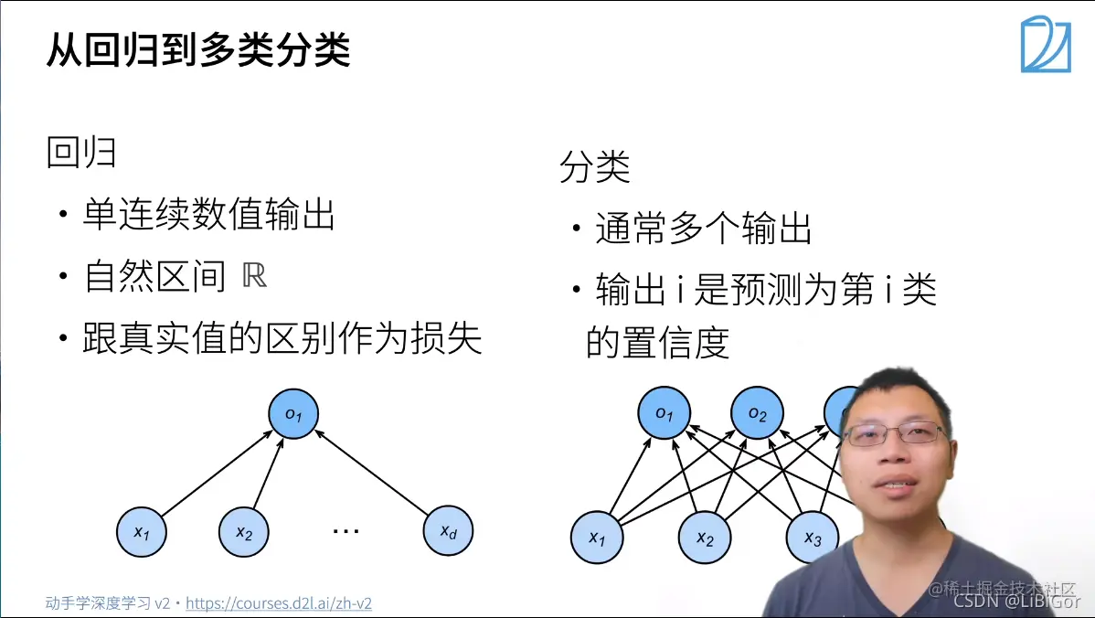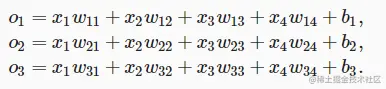 为了更简洁地表达模型,我们仍然使用线性代数符号。 通过向量形式表达为o=Wx+b, 这是一种更适合数学和编写代码的形式。 由此,我们已经将所有权重放到一个3×4矩阵中。 对于给定数据样本的特征x, 我们的输出是由权重与输入特征进行矩阵-向量乘法再加上偏置b得到的。