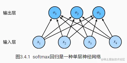 我们可以用神经网络图下来描述这个计算过程。 与线性回归一样,softmax回归也是一个单层神经网络。 由于计算每个输出o1、o2和o3取决于 所有输入x1、x2、x3和x4, 所以softmax回归的输出层也是全连接层。