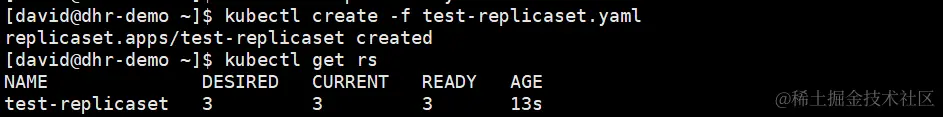 与创建ReplicationController一样,我们仍然使用命令kubectl create来创建ReplicaSet: