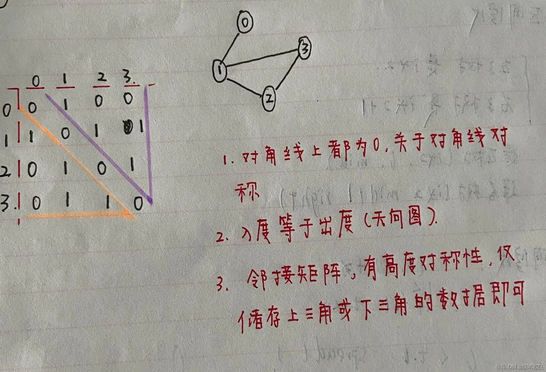 3、存储邻接矩阵需要n*n个空间,但因为高度对称,所以只需要一个上三角或者下三角的空间即可 (n-1)*n/2;