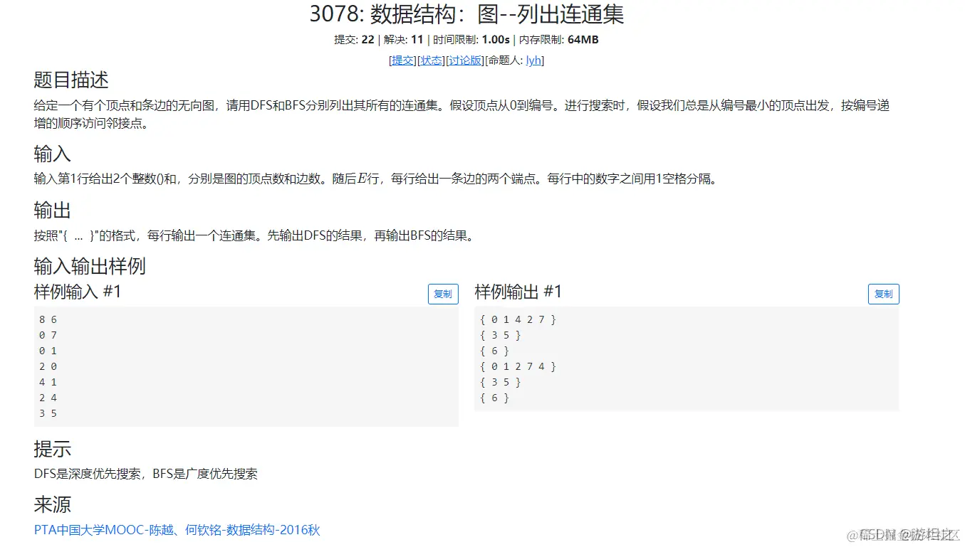 题目给出从编号最小的开始,那么我们可以从0开始遍历,先找到他的邻接点,在推而广之,找到他的邻接点的邻接点,这样我们就可以遍历出所有有路的节点了。那么对于访问过的节点,为了防止重复访问,导致程序崩溃,我们设置一个visit[]数组,用来判断是否遍历过。
