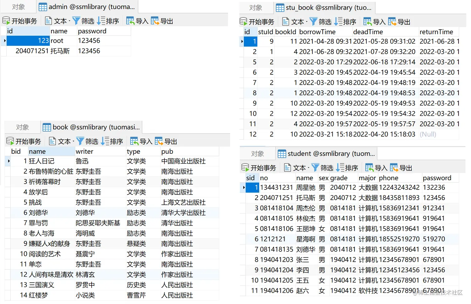 书籍表:存放书籍信息,包括名字,作者,类型,出版社,对书的操作。