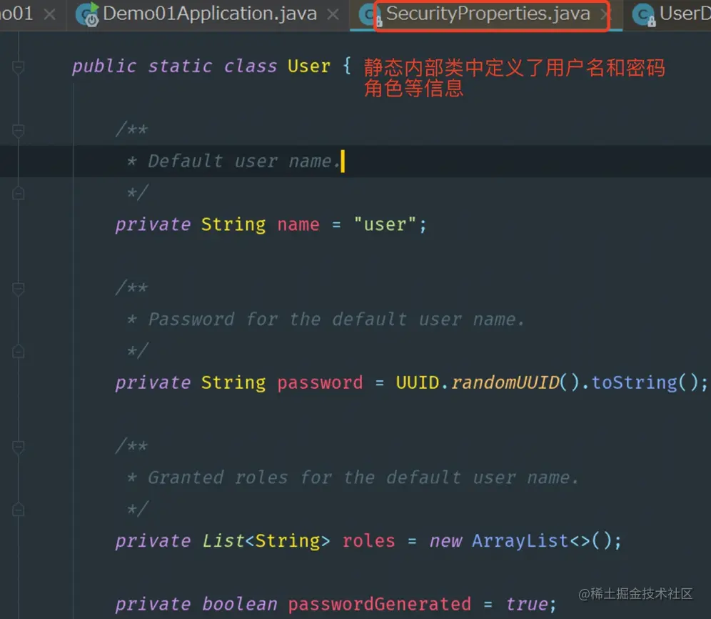 可能有小伙伴会很好奇,这个随机的密码到底是在哪里生成的呢?一一哥 带各位分析一下Spring Security的源码,来看看这个密码的生成策略。这个默认的用户名和密码其实是在SecurityProperties类中定义的,源码如下图: