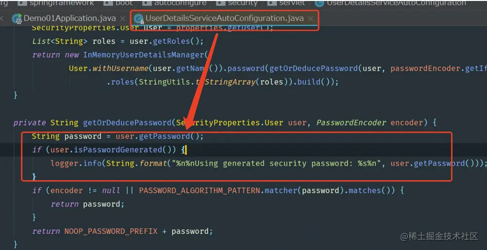 而控制台上打印的密码日志,是在UserDetailsServiceAutoConfiguration类的getOrDeducePassword()方法中输出的。