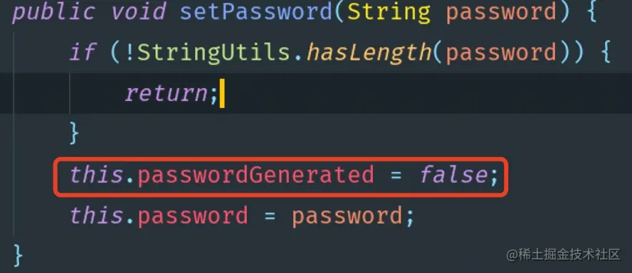 在这里配置了自定义的用户名和密码后,在Spring Security的源码中,会通过调用SecurityProperties的 set()方法 注入到对应的属性中。我们来看下 SecurityProperties.User#setPassword() 方法的源码: