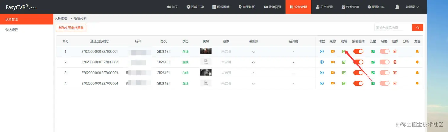 1)进入【设备管理】界面,点击进入通道: