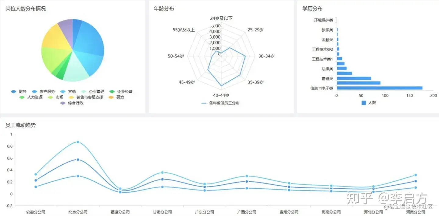 - 各工龄段人数:根据各工龄的人员数据的占比,来分析公司各个层级的人员,形成各个层级的梯队,从而对梯队进行人员优化。