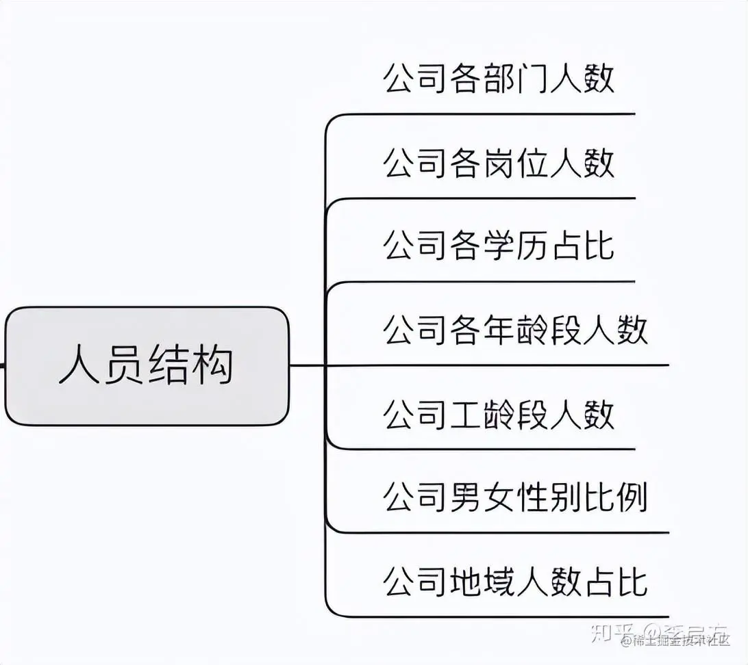 - 公司各岗位人数:主要了解关键岗位的人员数量,同时浏览各个岗位的人数,来判断岗位人数是否合理,时候是可以裁人数