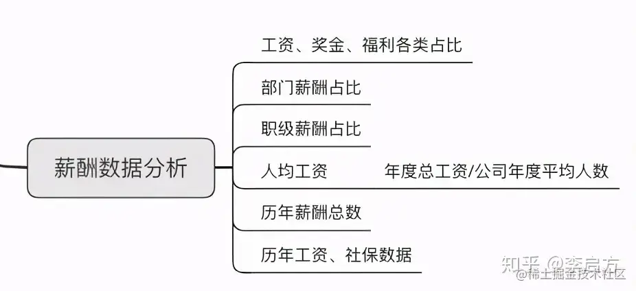 - 工资、奖金,福利各类别占比:分析年度薪酬中各个类别的薪酬占比,从而对各个类别的占比数据有个合理的判断