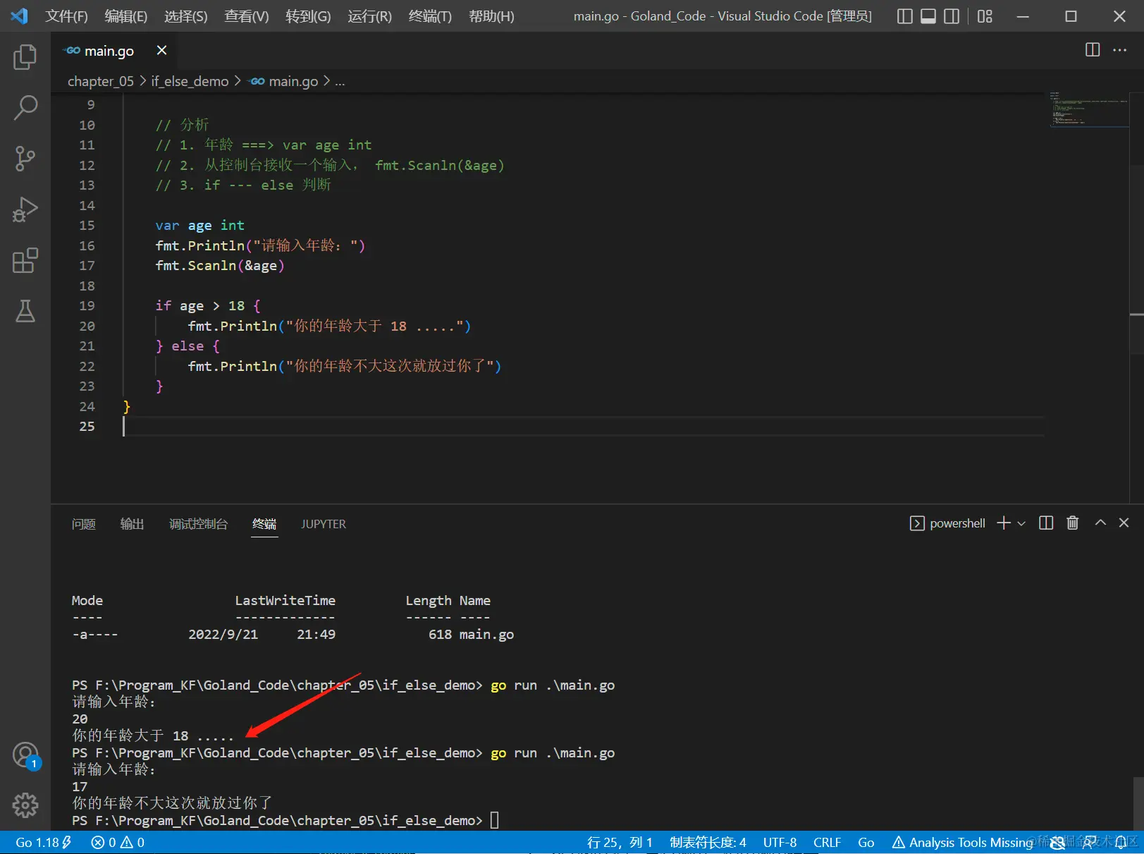 // 2. 从控制台接收一个输入, fmt.Scanln(&age)