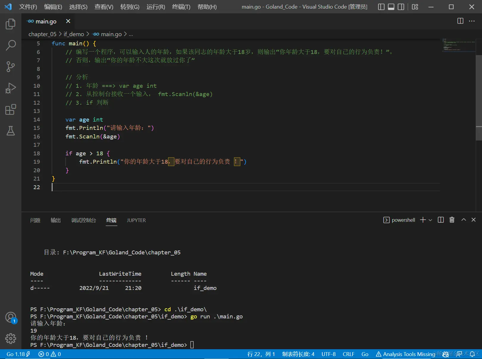 fmt.Println("你的年龄大于18,要对自己的行为负责 !")