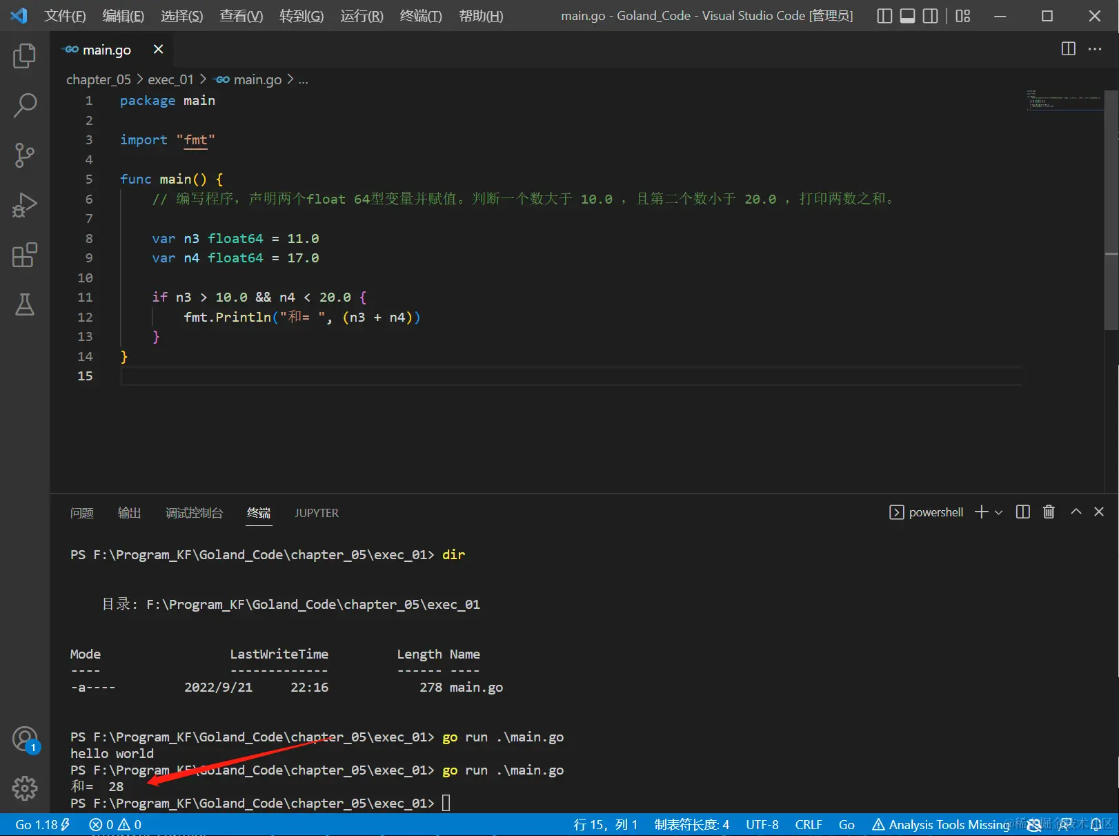 - 编写程序,声明两个float 64型变量并赋值。判断一个数大于 10.0 ,且第二个数小于 20.0 ,打印两数之和。