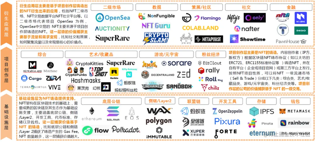 基础设施主要为 NFT 的铸造标记提供底层支撑;项目创作主要是 NFT 艺术藏品、NFT 游戏/元宇宙,通过创作者和消费者之间的一级交易实现商业营收;衍生应用主要是 NFT 社交、NFT 数据交易平台,以数据流量影响力实现商业变现。
