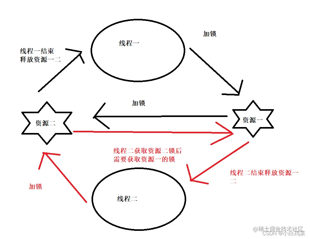 如图,这里线程一先获取了资源一,线程二获取了资源二,但是线程一要想完成或者说释放资源一给线程二使用就必须先得到资源二的锁结束线程再去释放,线程二也是同样的情况,这里就出现死锁的情况 。