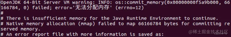 OpenJDK 64-Bit Server VM warning: INFO: os::commit_memory(0x00000000f5a9b000, 66166784, 0) failed; error='无法分配内存' (errno=12)