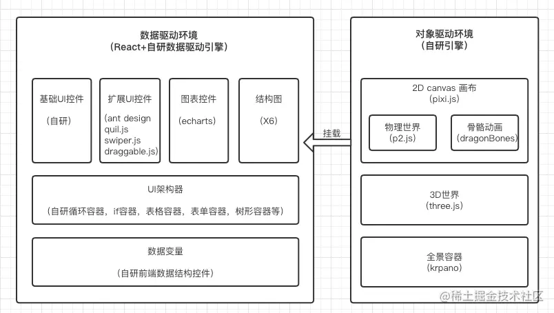 如上图所示,iVX的web应用,包含两大环境,一为数据驱动环境,即以react为基础的dom环境,二为对象驱动环境,是以html canvas为基础的动画与游戏环境。两套环境相对独立,对象驱动环境是以一个react节点的方式挂载在数据驱动环境中,因此无论应用中是否用到了数据驱动环境下的组件,数据驱动环境都会首先加载。