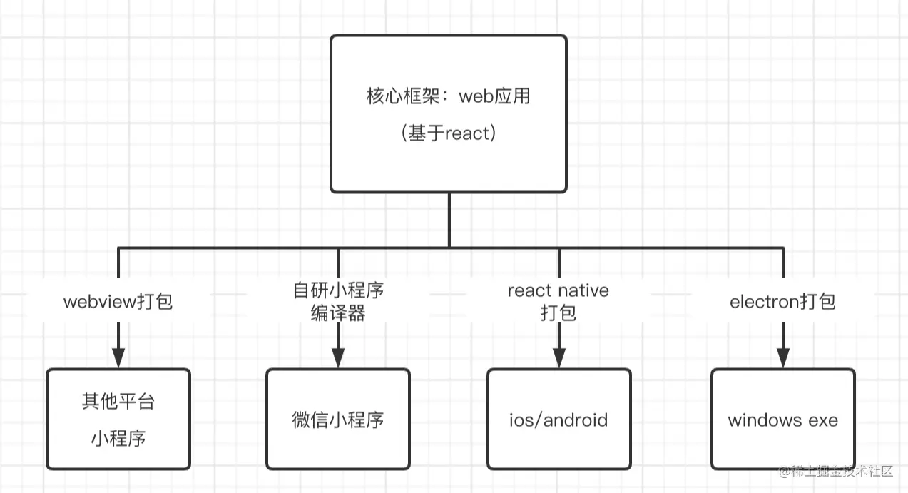 iVX的前端核心框架为web应用,主体使用react架构,部分内部模块使用了自研的对象驱动引擎,并引用了pixi.js, three.js等画布渲染库。同时,web应用可以通过不同的打包方法生成其他类型的应用