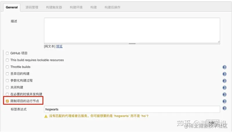勾选“限制项目的运行节点”,将之前节点的标签写到此处,这个配置会使之后的构建都会在限制的节点上进行: