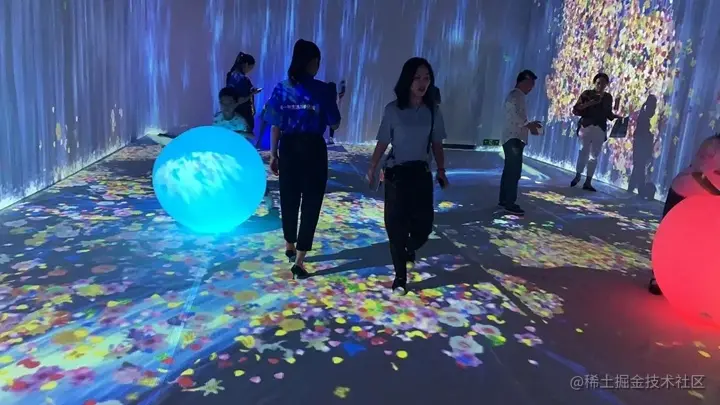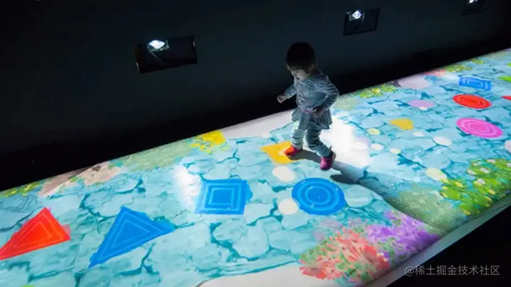 它是使用顶部悬挂的投影仪将图像投影到地面上,通过视觉识别系统走过该区域的观赏者行为动作,观赏者无论用手还是用脚都能与图像中的内容进行互动,还可以玩一些游戏,比如踢足球、摸鱼、下棋等。