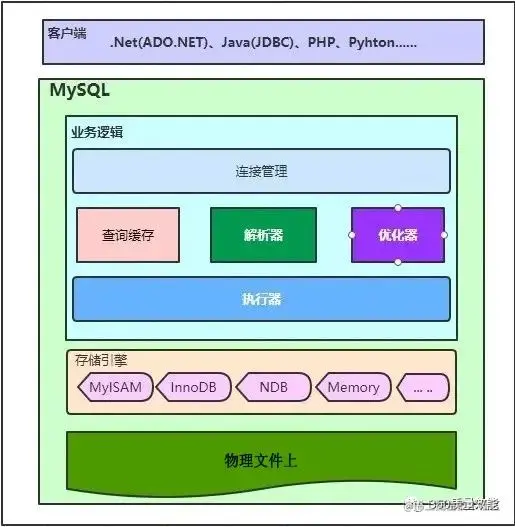 **客户端:**这里指连接MySQL各种形式,如.Net中使用的ADO连接、Java使用JDBC连接等,MySQL是客户端和服务器模式,前提先建立连接,才能传输数据,处理相关逻辑。