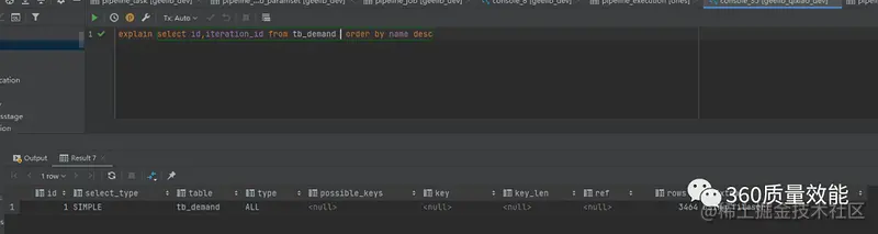 Using filesort:代表MySQL会使用一个外部索引对数据进行排序(文件排序),而不是使用表内索引。这种情况在SQL查询需要避免,最好不要在Extra中出现此类型,如图: