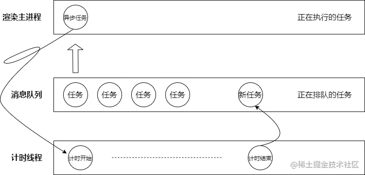 当渲染主线程执行到一个异步的任务时,会将任务交给计时线程,计时线程执行结束后将任务重新交给消息队列中,这样永不堵塞。
