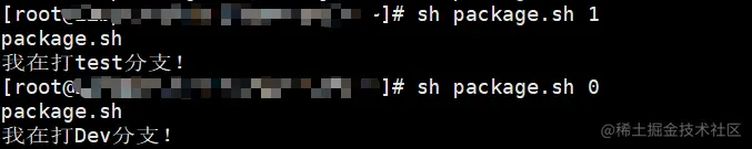这里解释下${0}表示执行的第一个参数--即文件名,这串代码表示的是如果我执行该命令时给的参数是0就打印我在打Dev分支!,给1打印我在打test分支!,这里要注意if那里的中括号,里面的内容要加空格,不然有问题,反正就是写shell就多打点空格,记着就行;fi表示结束,固定的搭配,不可不写;看下执行情况;