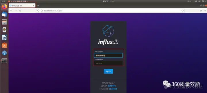 首先在终端键入启动influxdb服务的指令,然后在虚拟机的火狐浏览器地址栏输入 http://localhost:8086 1,点击回车键进入influxDB浏览器访问首页。首次登录会设置用户名,密码,点击sign in完成登录。