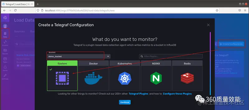依次点击Data → Telegraf → Create Configuration → continue。在Bucket选择刚才创建的 “demo_bucket“ ,监控目标选择系统System,然后点击continue。
