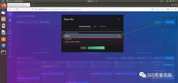 点击Save会保存刚才的图,在选择target dashboard,可以选择已经存在的system ,这里将可视化图命名为usage_system_graph。