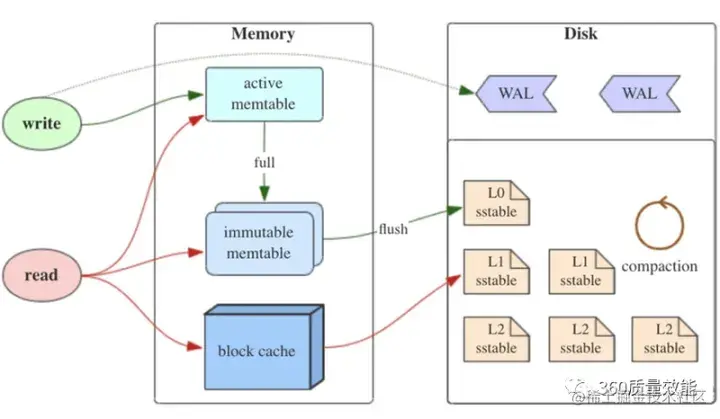 LSM树包含三部分:Memtable,Immutable和SSTable。MemTable是内存中的数据结构,用于保存最近产生的数据,并按照Key有序地组织数据。内存并不是可靠存储,若断电就会丢失数据,因此通常会使用预写式日志(Write-ahead logging,WAL)的方式来保证数据的可靠性。
