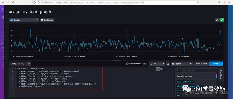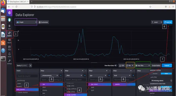 点击Export,在From这里选择刚才创建的bucket:demo_bucket,在第一个filter那里会在选择bucket之后,默认出现_measurement,选择cpu,相当于关系型数据库中的表,在第2个Filter处选择可视化的字段。例子选择的是usage_system(系统用量百分比),相关的Filter选定之后,点击submit,就会呈现出可视化的结果,这里默认的是Graph,出现如图所示的曲线图。在图中黄色线框部分可以选择动态页面刷新时间,在绿色线框部分可以选择数据开始的时间。