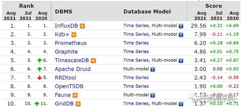 InfluxDB是时序数据库中应用比较广泛的一种,在DB-Engines TSDB rank中位居首位,可见InfluxDB在互联网的受欢迎程度是非常高的。下图是截止到2021年8月时序数据库的排名情况。