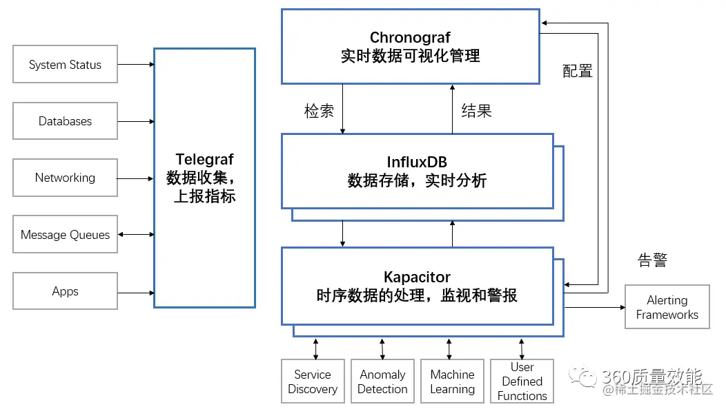 TICK架构 是 InfluxData 平台的组件的集合首字母缩写,该集合包括Telegraf、InfluxDB、Chronograf和 Kapacitor。TICK架构以及各组件分工情况如图所示: