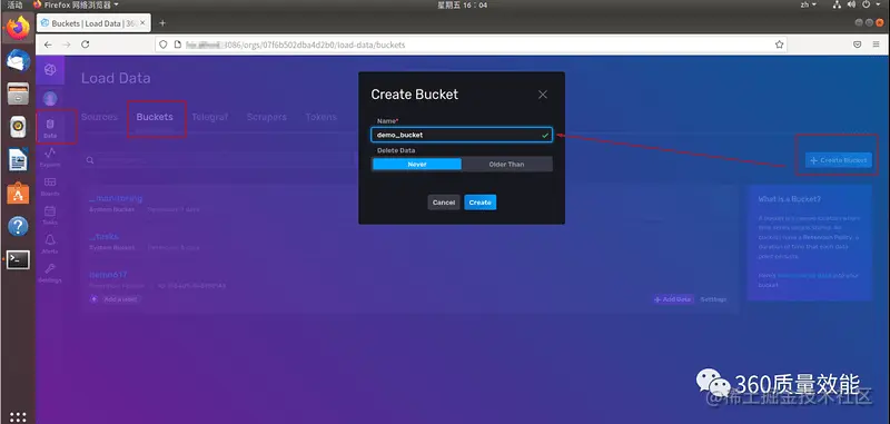 依次点击 Data → Bucket → Create Bucket,在弹框中输入bucket名字,然后点击创建,完成bucket的创建,此处创建了一个name为demo_bucket的 bucket。