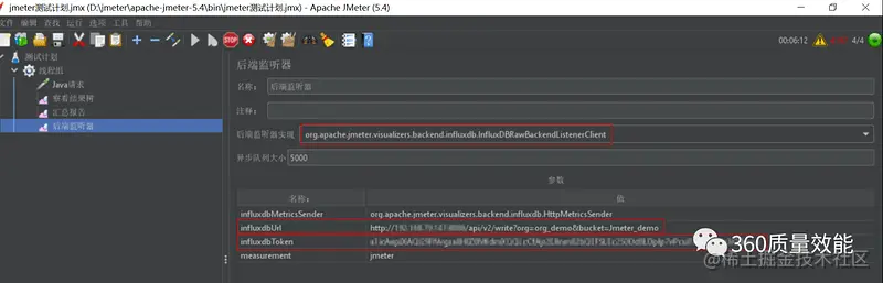 通过双击jmeter.bat进入Jmeter工作界面,创建一个线程组(Thread Group),在线程组中点选Loop Count Infinite,然后依次添加Java请求(Java Request),查看结果树(View Results Tree),汇总报告(Summary Report),后端监听器(BackendListener)。主要是在后端监听器填写相关参数,influxdbUrl要修改host,填写创建的组织org和bucket,influxdbToken就是上面创建的Jmeter_Token复制进去。若可以在influxdb中看到Java请求的数据结果,说明Jmeter与InfluxDB连接成功。