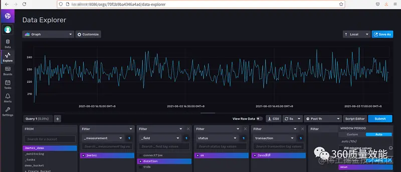 下图中红色框图则是曲线图的Flux查询语句,from表示数据源所在的bucket,|>表示管道连接符,range表示所查询数据所在的时间范围,其中 v.timeRangeStart 和 v.timeRangeStop 代表时间区间下拉框选中的时间段,filter是对range范围内的数据进行过滤,filter中的参数fn,是基于列和属性过滤数据逻辑的匿名函数,yield只在同一个Flux中出现多查询的时候才会出现,yield函数将过滤后的表作为Flux查询结果输出。