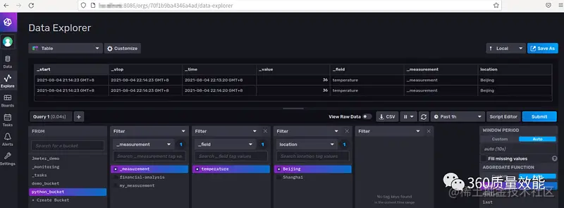 首先通过InfluxDBClient连接InfluxDB数据库,InfluxDBClient中需要提供url,token的作用是保证外部系统可以访问数据,不同的bucket有不同的token,org是数据存储所在的组织,在首次登录的时候完成创建。