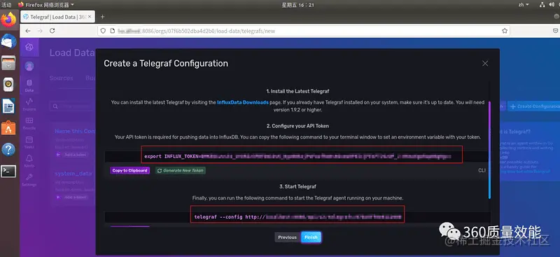 点击 create and verity 之后,并不能马上实现数据搜集,需要在当前页面获取API Token和Telegraf的启动指令,依次复制,并在终端执行指令。