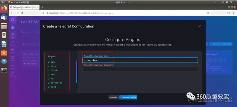 点击 continue 之后,可以知道要系统数据包括哪些,Telegraf Configuration name需要填充,此处填写为system_data,然后点击create and verity,完成这一操作。