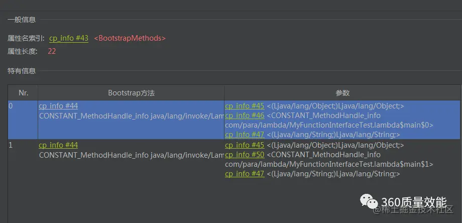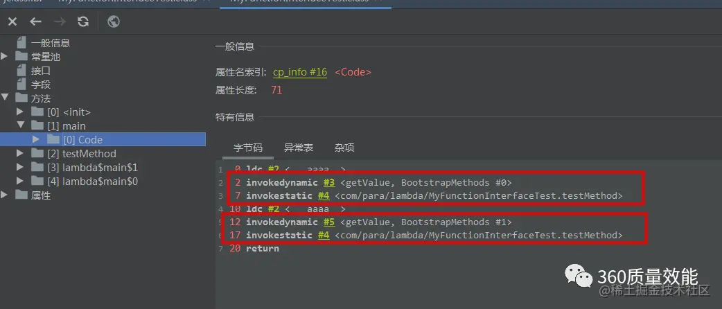 可以看到两个私有的静态方法干的就是Lambda表达式里面的内容,那么又是如何调用的生成的私有静态方法呢?如下图,通过分析main方法的L0,首先通过INVOKEDYNAMIC 指令调用是MyFunctionInterface的getValue方法的引用,以及后面的BootstrapMethods #0。使用jclasslib Bytecode viewer查看。